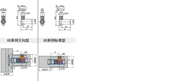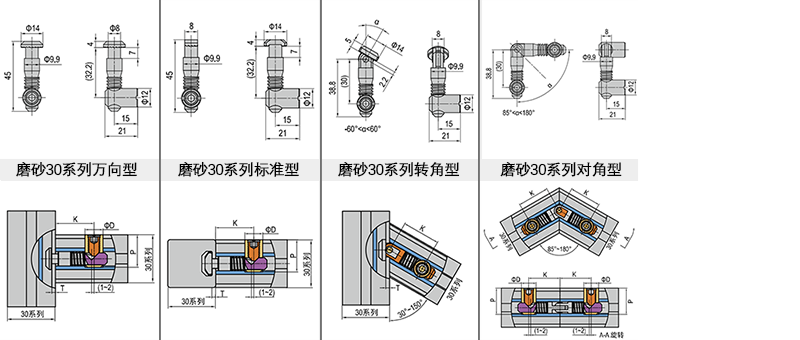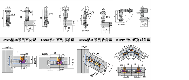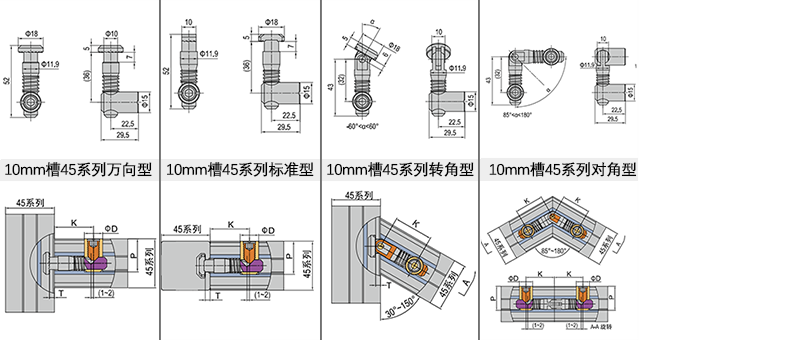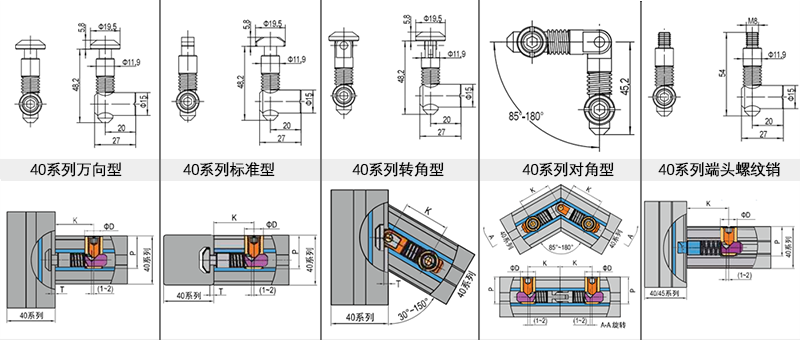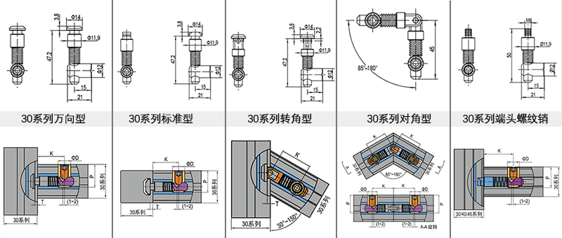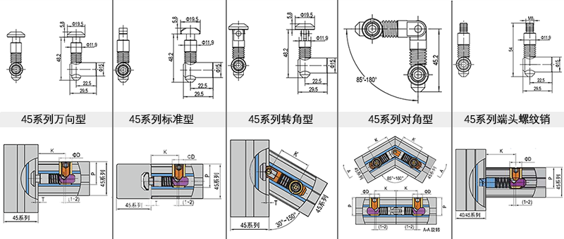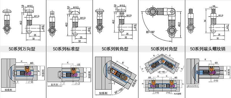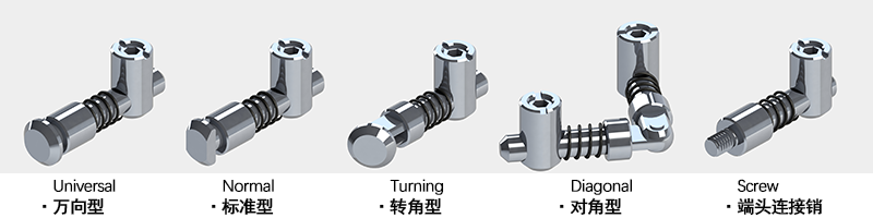 根据连接方式的不同分为万向型连接销、标准型连接销、转角型连接销、对角型连接销和端头螺纹销,可以实现型材之间30°到180°角度自由连接,是连接T槽铝型材快速和灵活的选择。